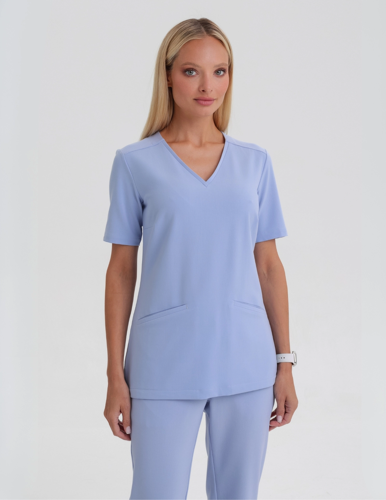 Taillierter medizinischer Kasack, der das Dekolleté, den Hals und die Schultern wunderschön betont. Seitliche Schlitze für zusätzlichen Komfort.