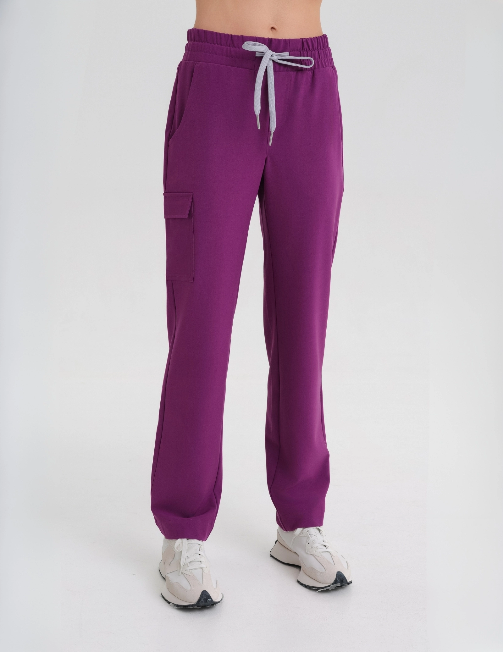 Hose mit hoher Taille und weitem Bein. Bequem geschnitten – sie schneidet im Schritt nicht ein. Der breite, elastische Bund betont die Taille. Es gibt eine Cargo-Tasche am Bein. Sie passen perfekt zur taillierten Casy-Bluse.