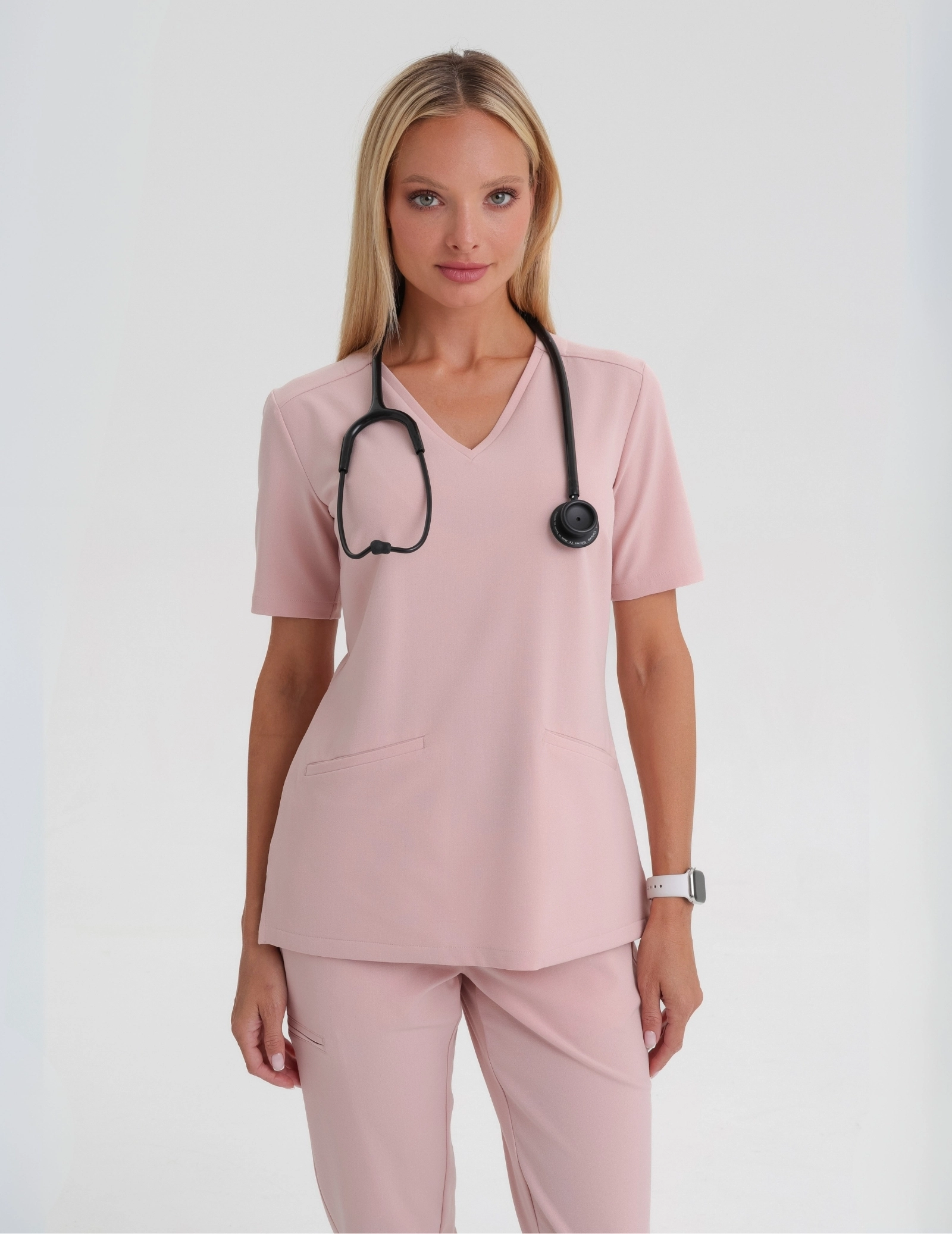 Taillierter medizinischer Kasack, der das Dekolleté, den Hals und die Schultern wunderschön betont. Seitliche Schlitze für zusätzlichen Komfort.